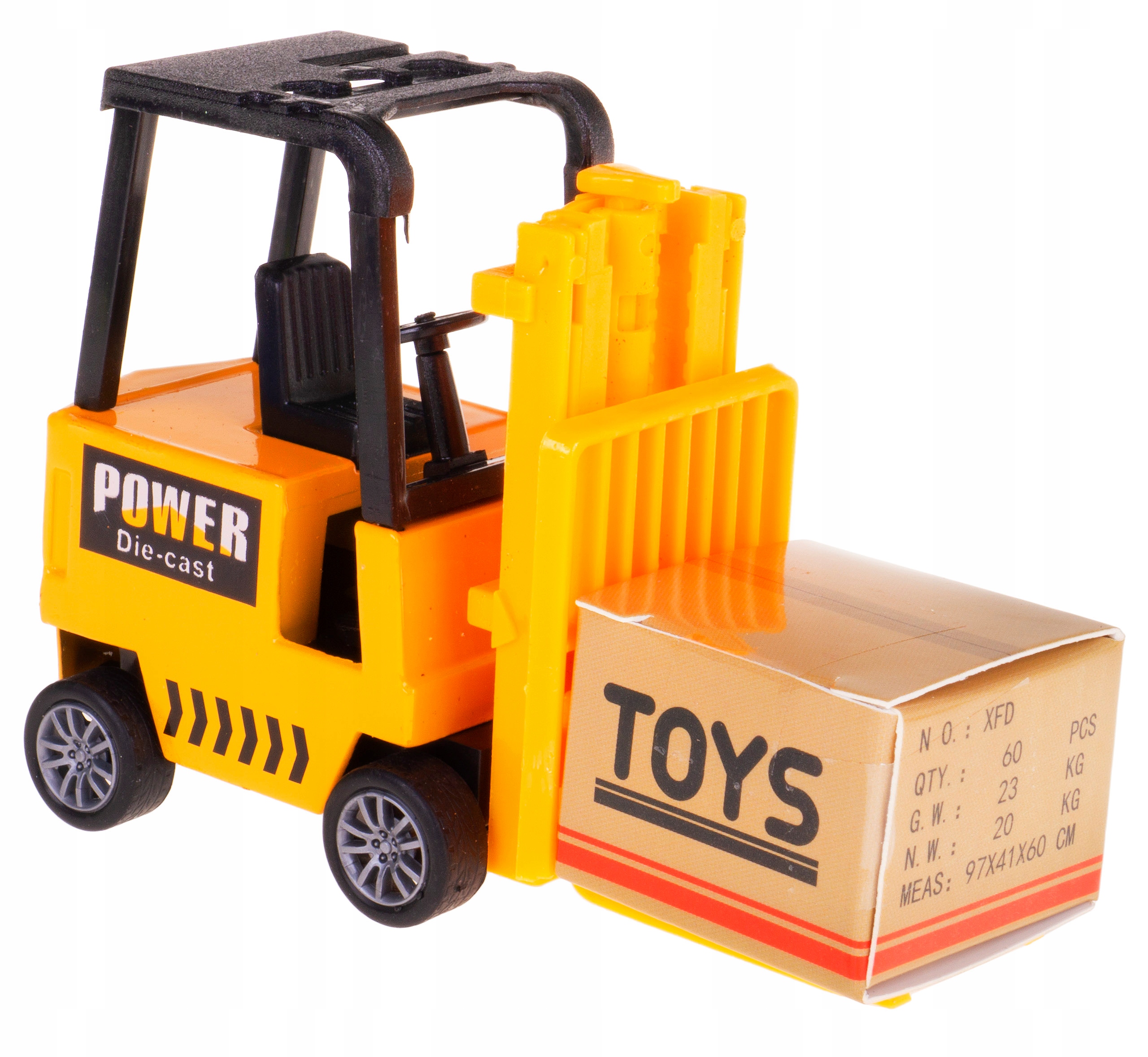 Модель вилочного погрузчика из металла и пластика с инерционным приводом на резиновых шинах.
