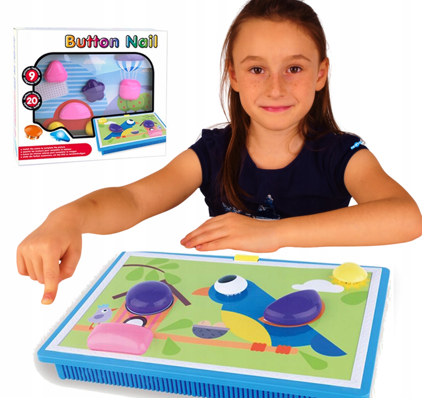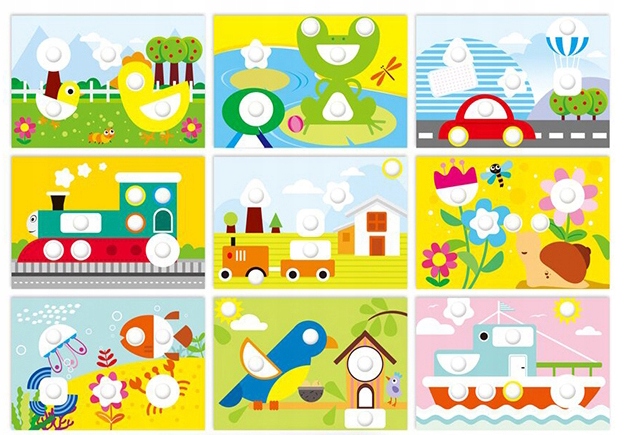 Начните играть с вытаскивая красочные круглые пуговицы. Выберите карту, поместите ее на накладку и начните играть, размещая круглые части в нужных местах.