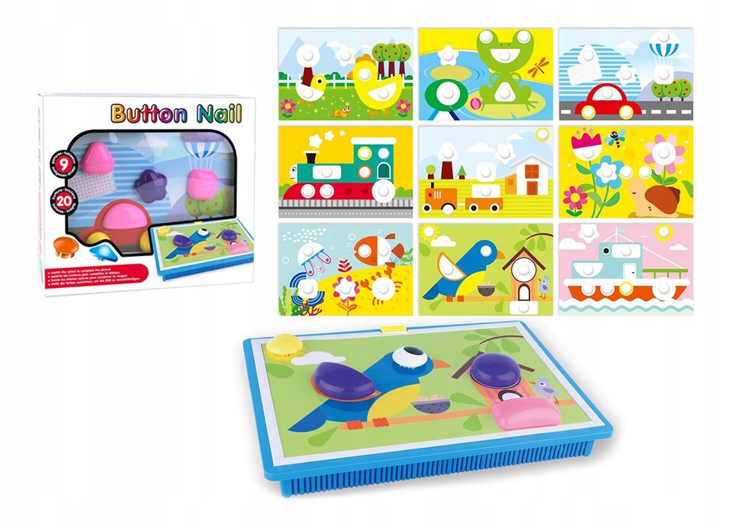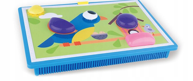Помимо колышков в наборе также есть карточки со схемами. Карточку с рисунком следует положить под прозрачную доску, а затем можно создать мозаику, расставив на доске цветные колышки. Ребеноктакже может создавать свои собственные композиции из разноцветных пуговиц.
