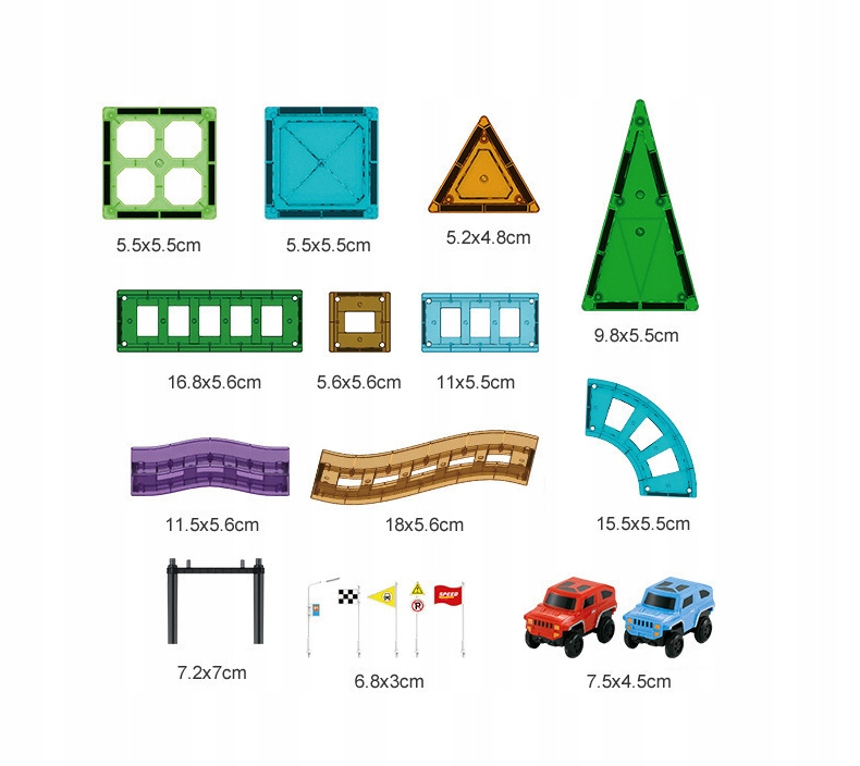 В наборе есть плоские панели, части мостов и зданий, дорожки, автомобили, работающие на батареях, а также элементы окружающей среды (флаги, знаки, фонари). простой набор для сборки и разборки.