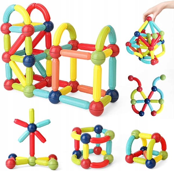 Блоки развивают практические навыки, развивают навыки пространственного мышления и улучшают зрительно-моторную координацию. Магнитные стержни и разноцветные шарики побуждают к экспериментам и конструированию. Они позволяют построить любые фигурки всего за несколько мгновений.