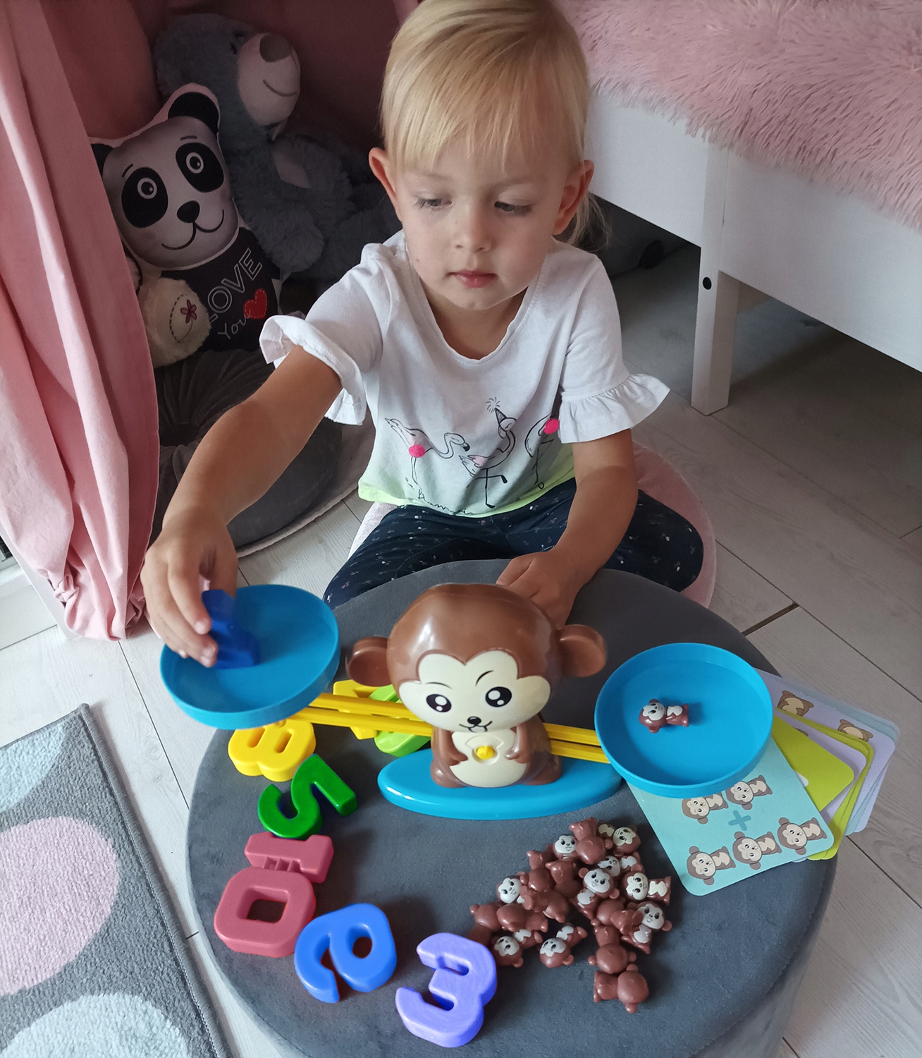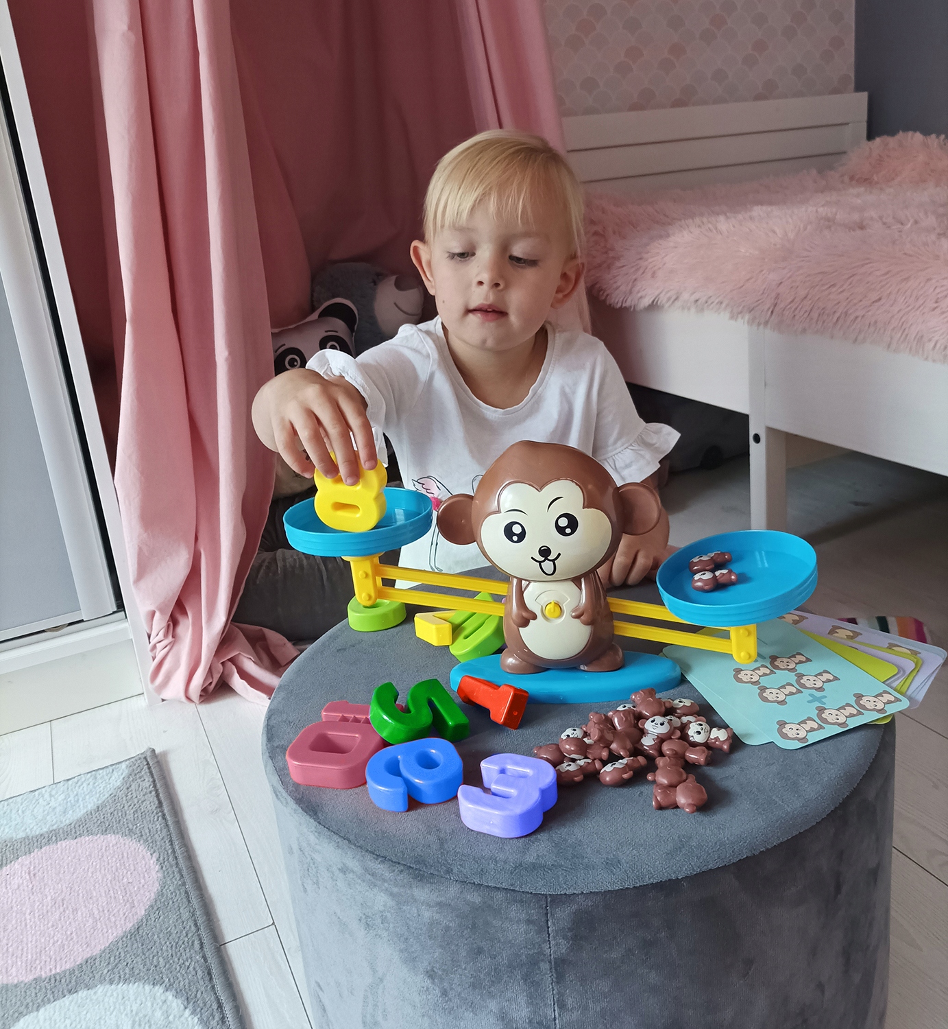 Обезьянка, выполняющая роль весов, является центральным элементом набора. Каждое число имеет свой вес, который соответствует весу фигурок монстров. Ребенок должен сопоставить число на карточке с соответствующим весом, что поможет ему понять, как оно работает, и научиться считать.
