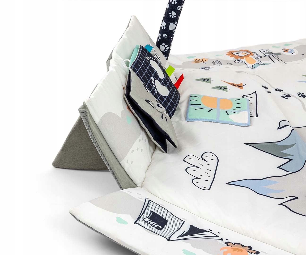 Сложные стороны, идеально подходящие для самых молодых детей, обеспечивают безопасное место для игры или сна. Оболочки прикреплены за пределами коврика с дополнительными крючками, помещенными в его дно. Образовательный коврик