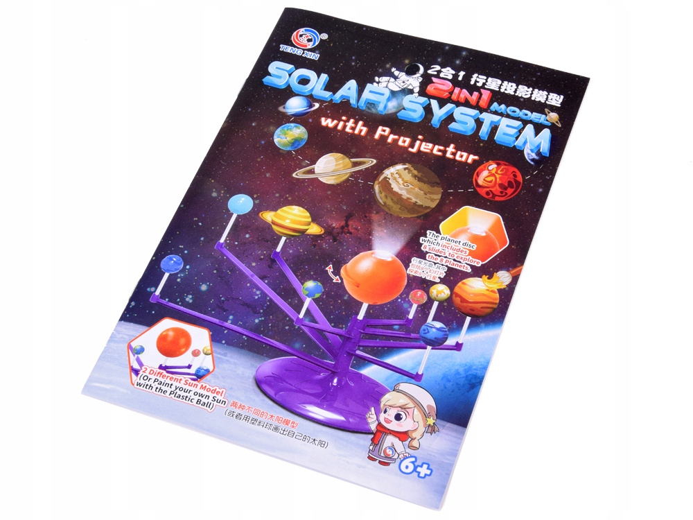 В комплект также входит оранжевый шар, изображающий Солнце, оснащенный батарейками, и проектор, отображающий планеты на потолке.