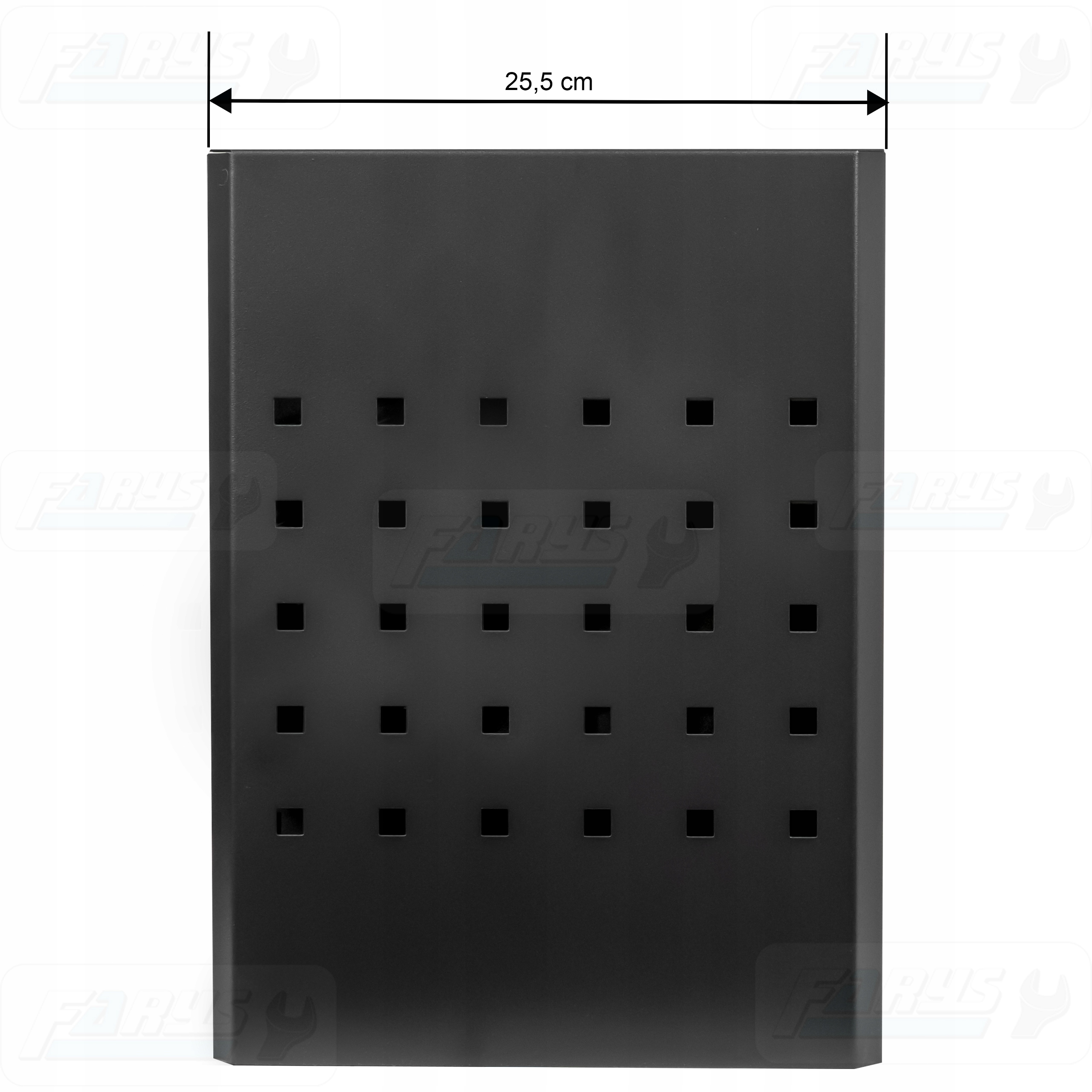 Изготовлен из перфорированного листового металла, покрыт порошковой краской и имеет множество возможностей для подвешивания дополнительных крючков для инструментов (крючки в комплект не входят).