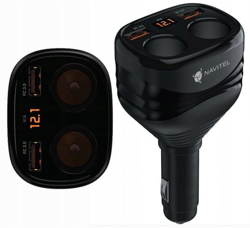 NAVITEL USP55 PRO — универсальный автомобильный разветвитель прикуривателя с зарядным устройством. функция. Он оснащен двумя USB-портами с функцией быстрой зарядки и цифровым дисплеем, показывающим напряжение бортовой сети и потребляемый ток.