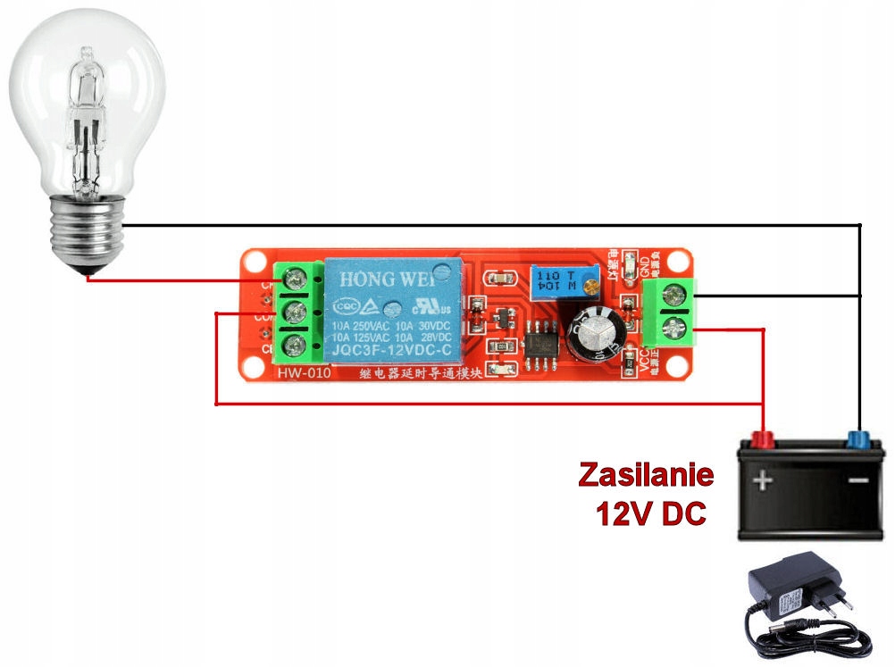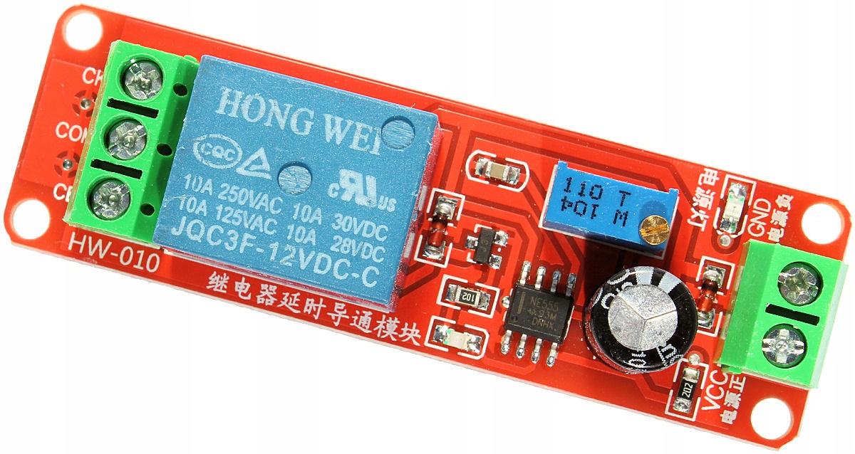 После подключения питания модуль начинает отсчет времени, установленного с помощью потенциометра, затем включает реле и оставляет его в этом состоянии до тех пор, пока не выйдет из строя источник питания. После сбоя питания реле отключается.