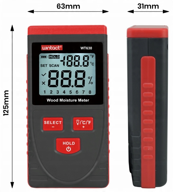 ▶️ На выбор доступно 8 режимов измерения, в зависимости от плотности древесины. Диапазон измерения подходит для большинства пород древесины.