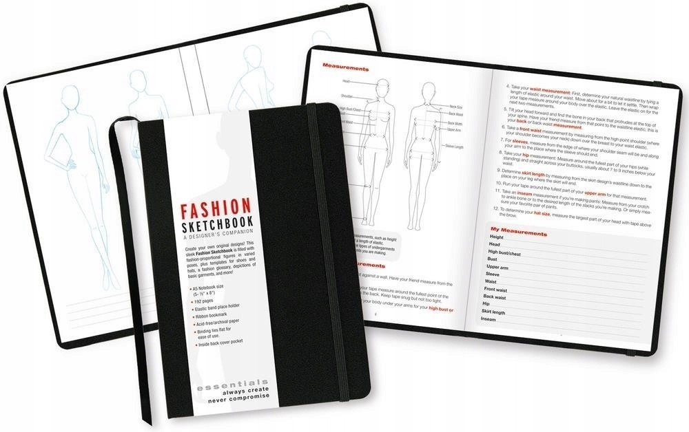 Альбом для рисования, который помогает дизайнерам создавать свои собственные творения и содержит несколько страниц информации о дизайне одежды. Внутри есть эскизы женских силуэтов с каждой стороны, чтобы можно было сконструировать одежду с детализированными элементами. В самом конце есть раздел, посвященный дизайну аксессуаров одежды, таких как головные уборы и обувь. Черная твердая обложка не отвлекает от творческих мыслей. Изделие имеет черную ленту-закладку, резинку и конверт сзади для мелких заметок и бумаг. 192 страницы