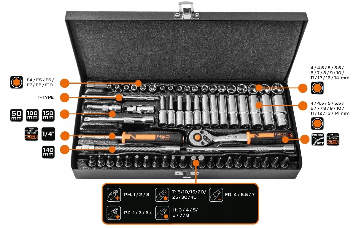 НАБОР ТОРЦЕВЫХ КЛЮЧЕЙ NEO 1/4" 63 шт. + ТРЕЩОТКА 10-008 БИТ