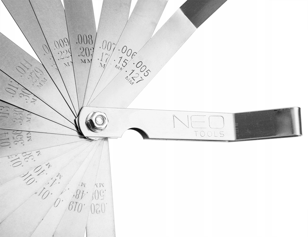 Толмомер на 16 гнутых лопастей (0,127 - 0,508 мм) 65МН/нержавеющая сталь 11-192 от NEO – практичный инструмент, позволяющий измерить расстояние между двумя элементами конструкции, когда невозможно использовать другой измерительный прибор. Он имеет 16 гнутых створок толщиной от 0,127 до 0,508 мм, результаты работы которых можно легко прочитать даже после вырезания инструмента из паза – поэтому его используют и в ситуациях, когда пространство ограничено. Он позволяет измерять зазоры подшипников или зазоры клапанов двигателя. В свою очередь садовод может самостоятельно проверить и отрегулировать зазор на электродах свечи зажигания газонокосилки или бензопилы. Щуп марки NEO изготовлен из твердой стали 65 МН и нержавеющей стали. Идеально подходит для автомастерских и гаражей автовладельцев.