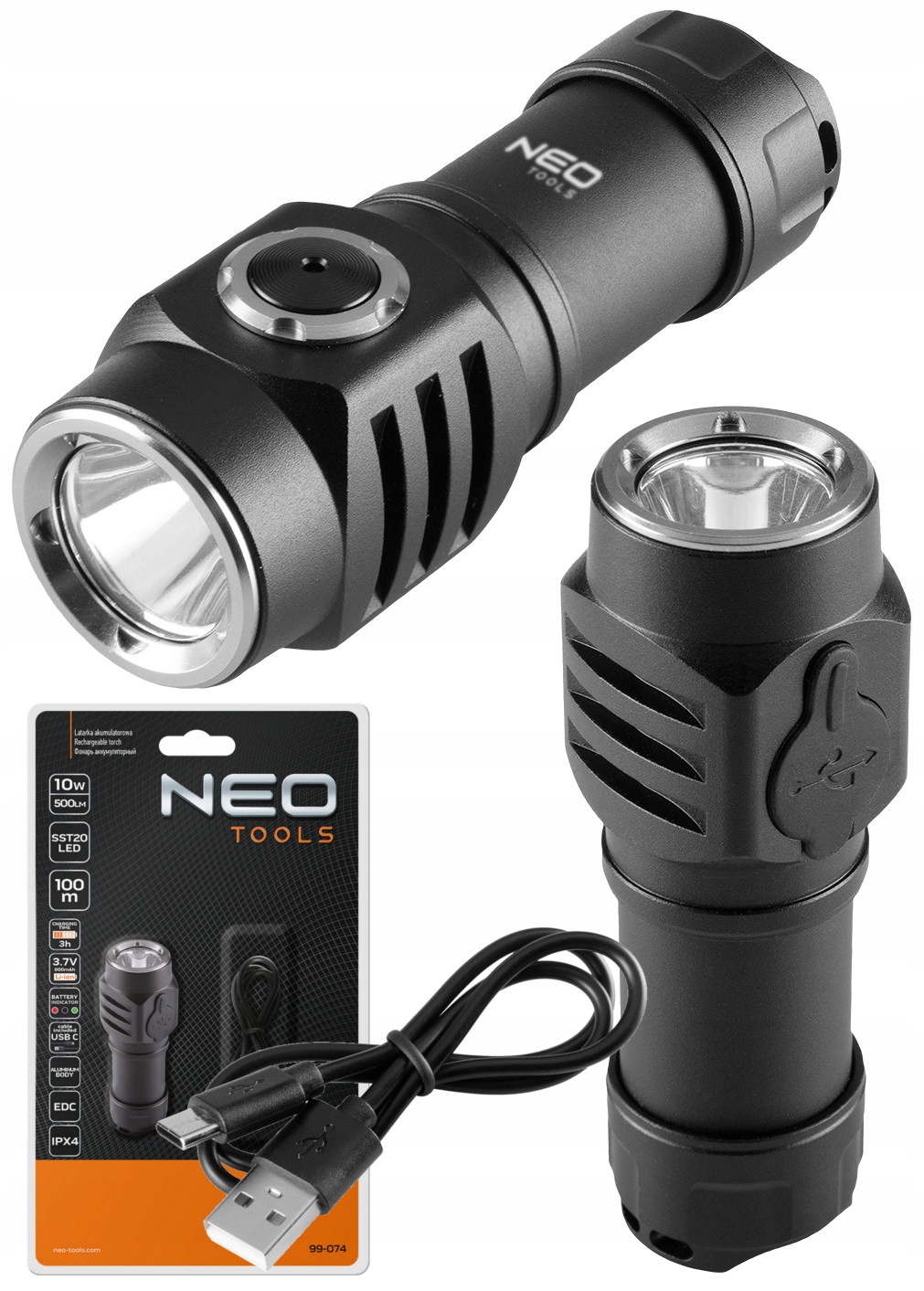 Фонарик аккумуляторный USB C 500 лм SST20 LED 99-074 NEO удобный источник света, устойчивый к механическим ударам, вибрациям и перепадам температуры, 10 Вт и 500 лм. Заряжается кабелем USB type C, входящим в комплект. Фонарик работает на базе литий-ионного аккумулятора напряжением 3,7 В емкостью 800 мАч.