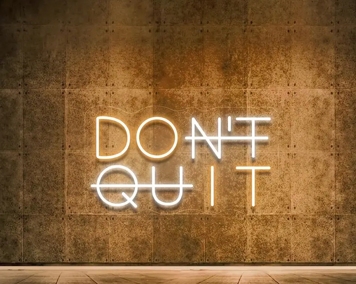 Светодиодный неон размерами 43 см в ширину и 23 см в высоту – стильный и вдохновляющий декоративный элемент с надписью «НЕ БРОСАЙСЯ», где слово «НЕ» перечеркнуто, что позволяет трактовать текст одновременно как «НЕ УХОДИТЬ» и «ДЕЛАТЬ ЭТО». Выразительные неоновые цвета: золотое слово «DO» и белое «QUIT» создают современный и энергичный дизайн. Идеально подходит для офисного или домашнего интерьера или в качестве мотивационного подарка. Неоновая вывеска работает от электричества и легко крепится на стену.