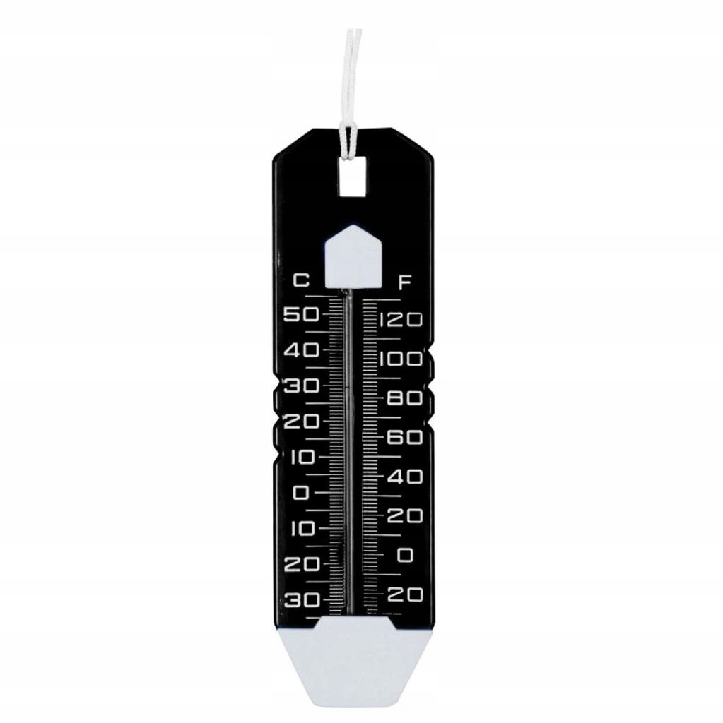 Большой плоский гигантский термометр предназначен для измерения температуры воздуха, а также воды для бассейна. Он изготовлен из черного, непрозрачного пластика с контрастной белой шкалой в градусах Цельсия и Фаренгейта с большими и чистыми числами. Термометр корпус украшен в центральной части с тиснением для облегчения сцепления. Масштаб термометра заканчивается двумя частями белого пластика, которые со вкусом вкуса белыми числами. Термометр оснащен струной, которая облегчает подвеску.