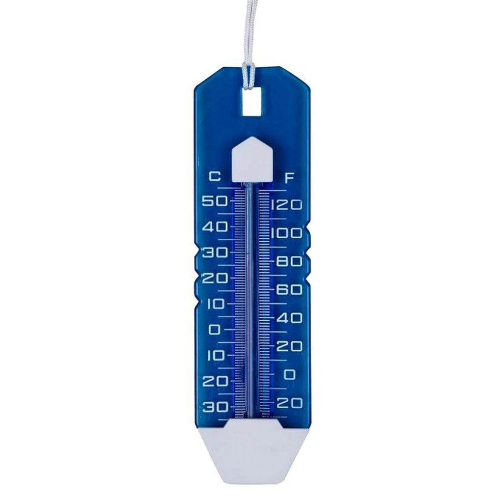 Большой плоский гигантский термометр предназначен для измерения температуры воздуха, а также воды для бассейна. Он изготовлен из синего синего, прозрачного пластика с контрастной белой шкалой в градусах Цельсия и Фаренгейта с большими и чистыми числами. Термометр корпус украшен в центральной части с тиснением для облегчения сцепления. Масштаб термометра заканчивается двумя частями белого пластика, которые со вкусом вкуса белыми числами. Термометр оснащен струной, которая облегчает подвеску.