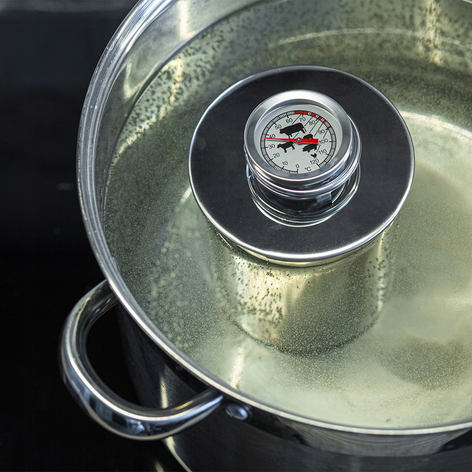 В середине крышки имеется гнездо с отверстием, позволяющим непосредственно измерять температуру мяса.