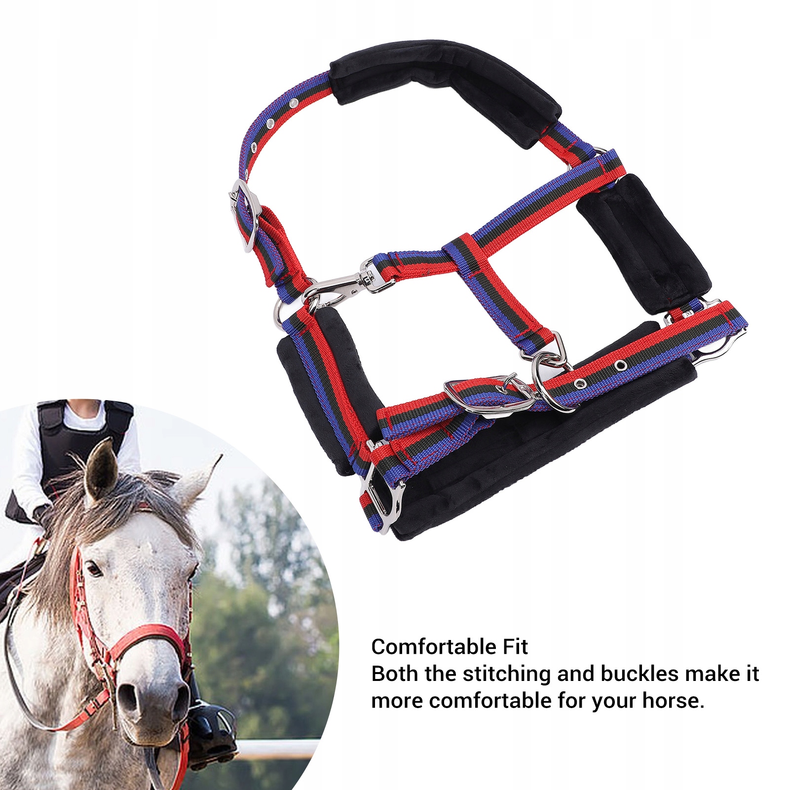 2. Регулируемая посадка: этот нейлоновый недоуздок простой конструкции с регулируемыми поводьями подходит для лошадей любого размера, что делает его удобным как для новичков, так и для опытных наездников.