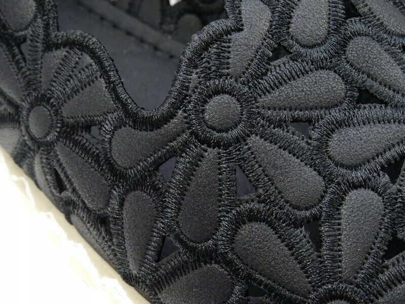 Обувь из экокожи, верх в цветочный узор с вырезами (ажур). Легкая подошва украшена характерной для модели соломенной тесьмой. Вставка изготовлена из мягкой губки, покрытой тканью для повышения комфорта при ношении.