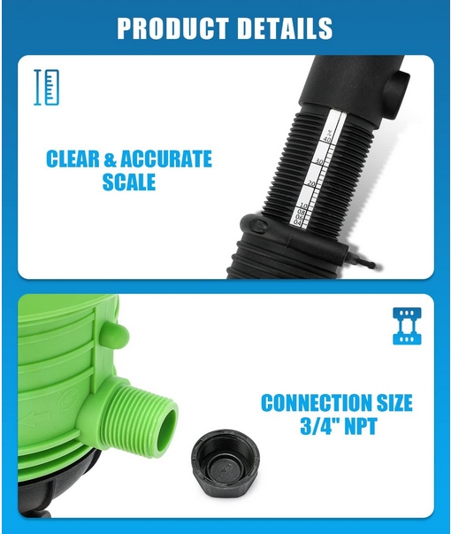 [Важные параметры]: 0,4–4 % (1:25–1:250); Рабочее давление: 0,3 ~ 6 бар (около 4,35 ~ 87 фунтов на квадратный дюйм); Диаметр входа и выхода: 3/4 дюйма (25 мм), диапазон расхода: 20–2500 л/ч (4,4–660,43 галлона/ч)