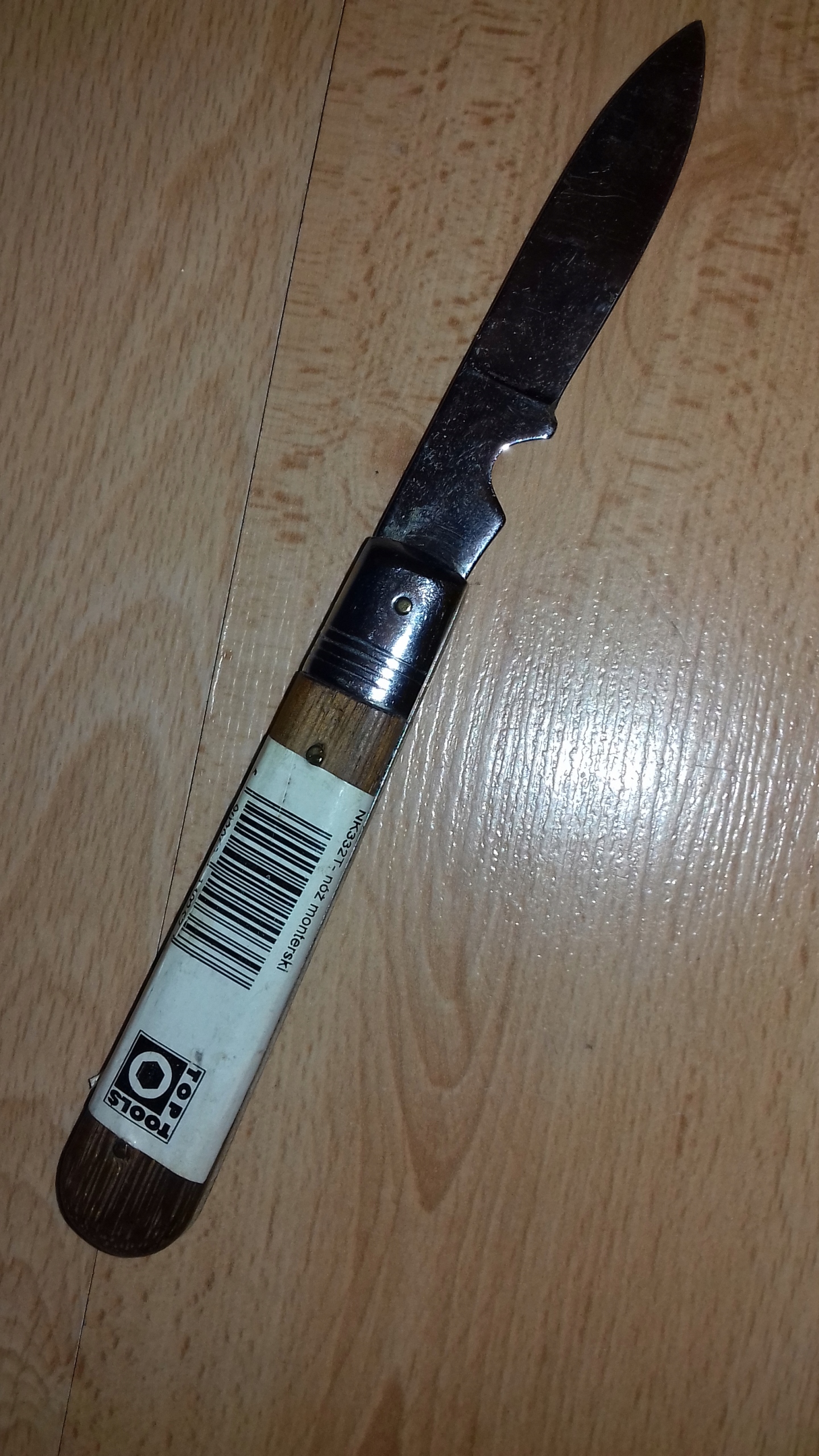 нож перочинный, длина: ручка деревянная 11 см, лезвие 8,5 см, ширина лезвия 1,6 см, состояние видно на фотографиях, наклейка на рукоятке