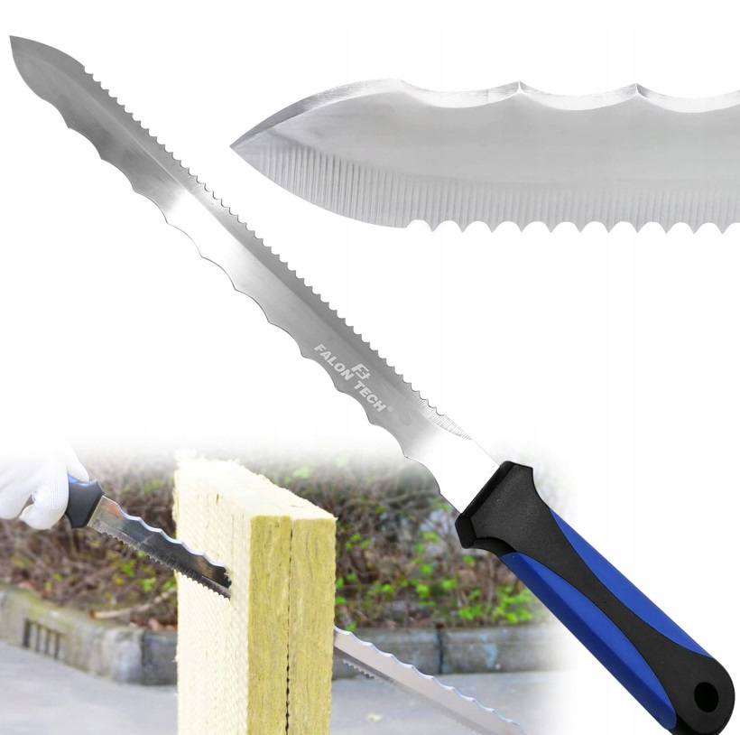 Лезвие из нержавеющей стали с двусторонними зубцами хорошо подойдет для резки различных материалов, таких как пенополистирол, минеральная вата, изоляция.