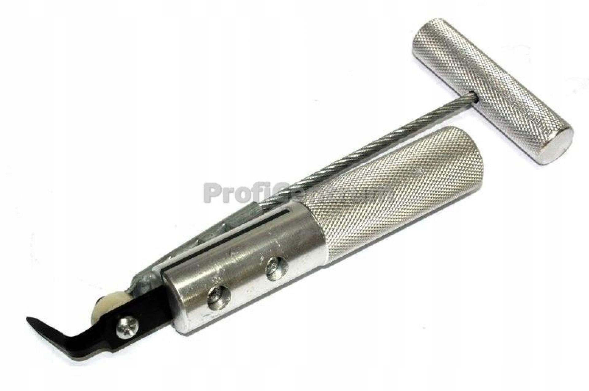 Нож предназначен для демонтажа автомобильных стекол, закрепленных оконным клеем. Позволяет одному человеку резать стекло. Он изготовлен из алюминия. Преимущество – прочная веревка, зажатая и обжатая на трех уровнях