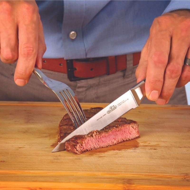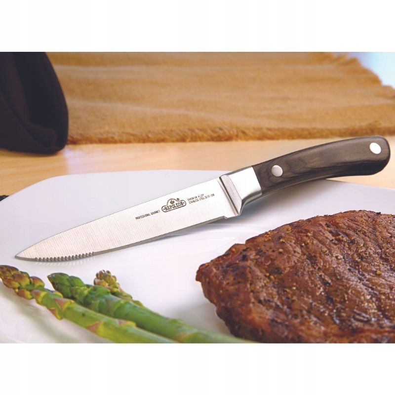 Нож для стейка Napoleon PRO — профессиональный нож, изготовленный из высококачественной нержавеющей стали. Рукоять обрамлена деревом, а сам нож хорошо сбалансирован, чтобы его можно было надежно держать в руке. Можно мыть в посудомоечной машине, но помните, что дерево может быть повреждено.
