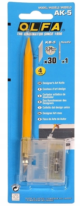 Скальпель Ольф АК-5 — нож для точной резки бумаги, фольги и картона. Держатель ножа имеет квадратное сечение, что предотвращает скатывание ножа со стола. Такая форма также позволяет надежно соединить его с новым контейнером для лезвий двумя способами. Первый способ - вставить держатель в направляющую вдоль боковой части контейнера, что удобно для хранения ножа с запасными лезвиями вместе.Второй способ - вставить держатель перпендикулярно контейнеру, благодаря чему он становится удобным стоять.