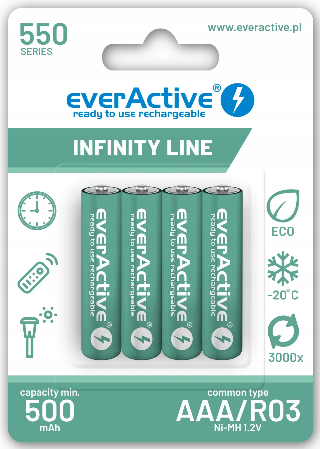 4 инновационных аккумулятора R03 AAA емкостью 550 мАч everActive, изготовленных по технологии «готов к использованию».