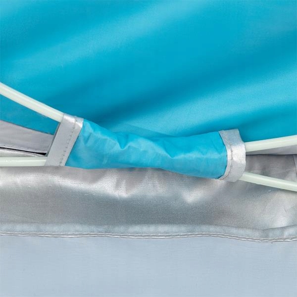 Палатка изготовлена из материалов высочайшего качества. Материал пола водонепроницаем, поэтому влажный песок не станет проблемой. Палатка также имеет покрытие, защищающее от УФ-лучей.