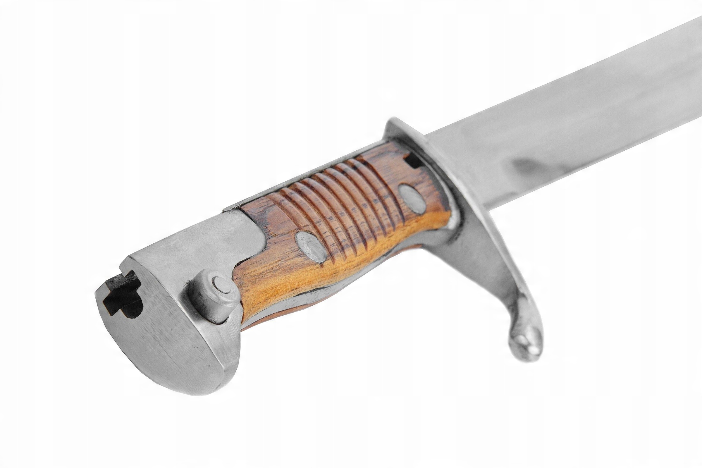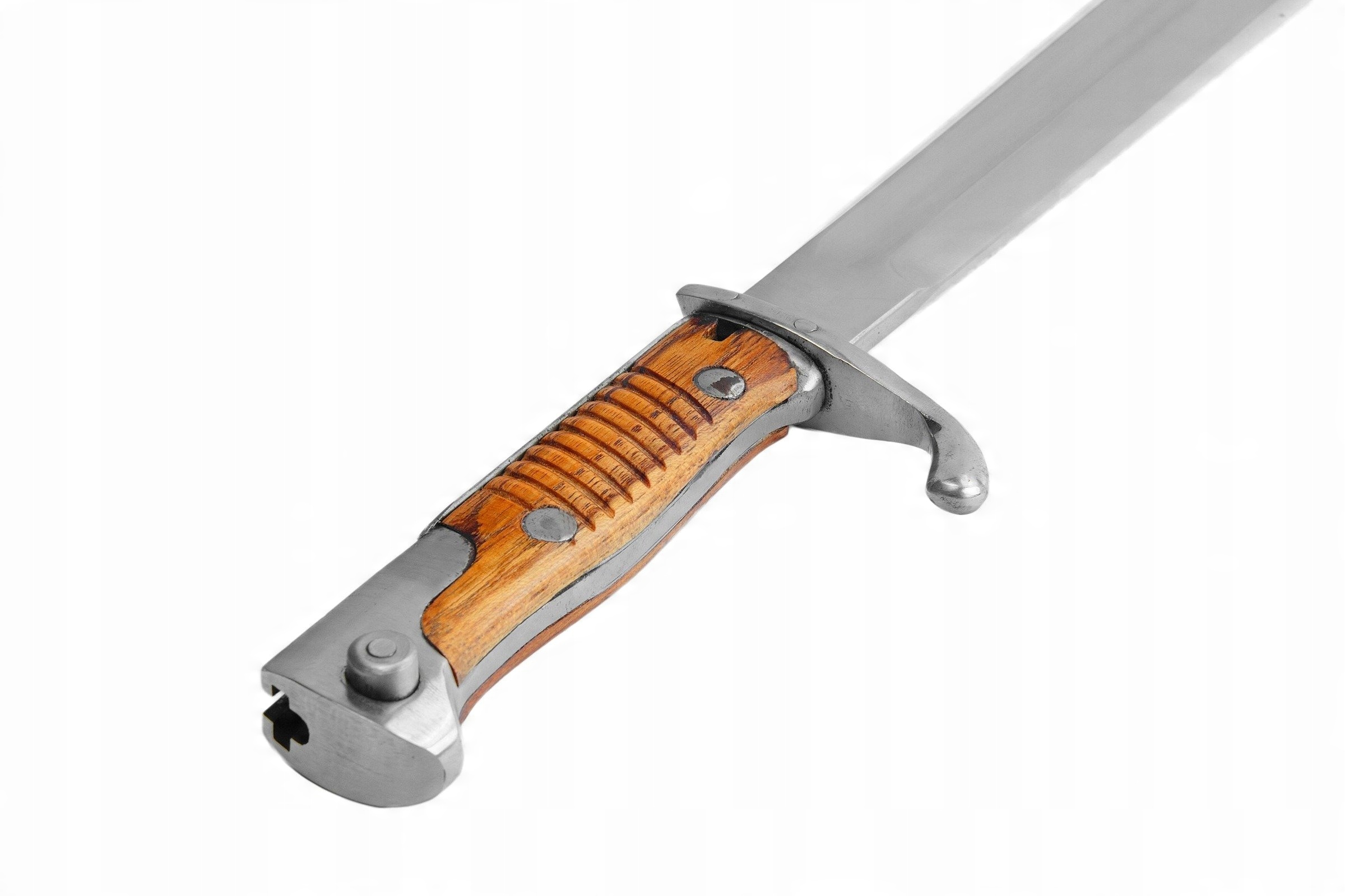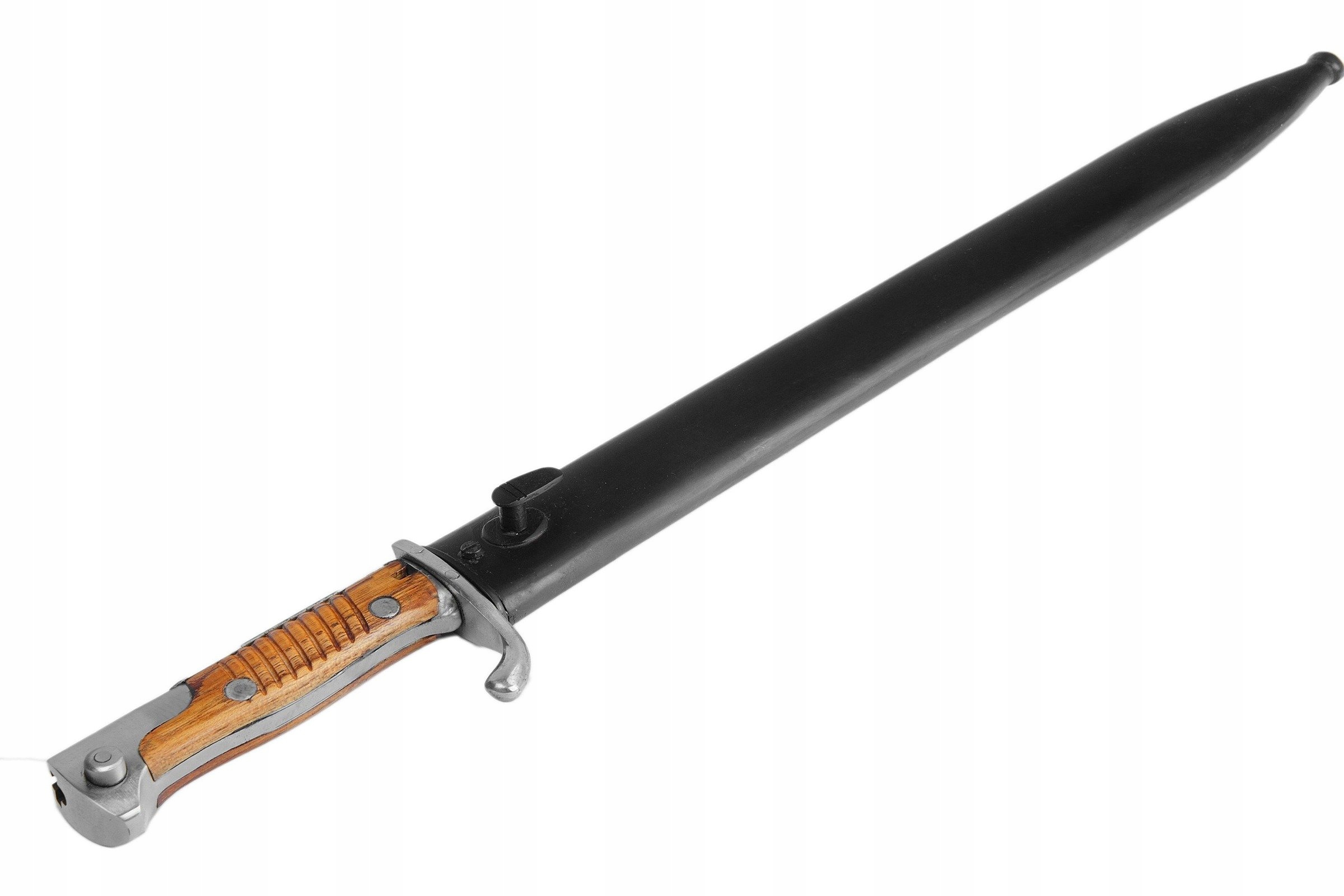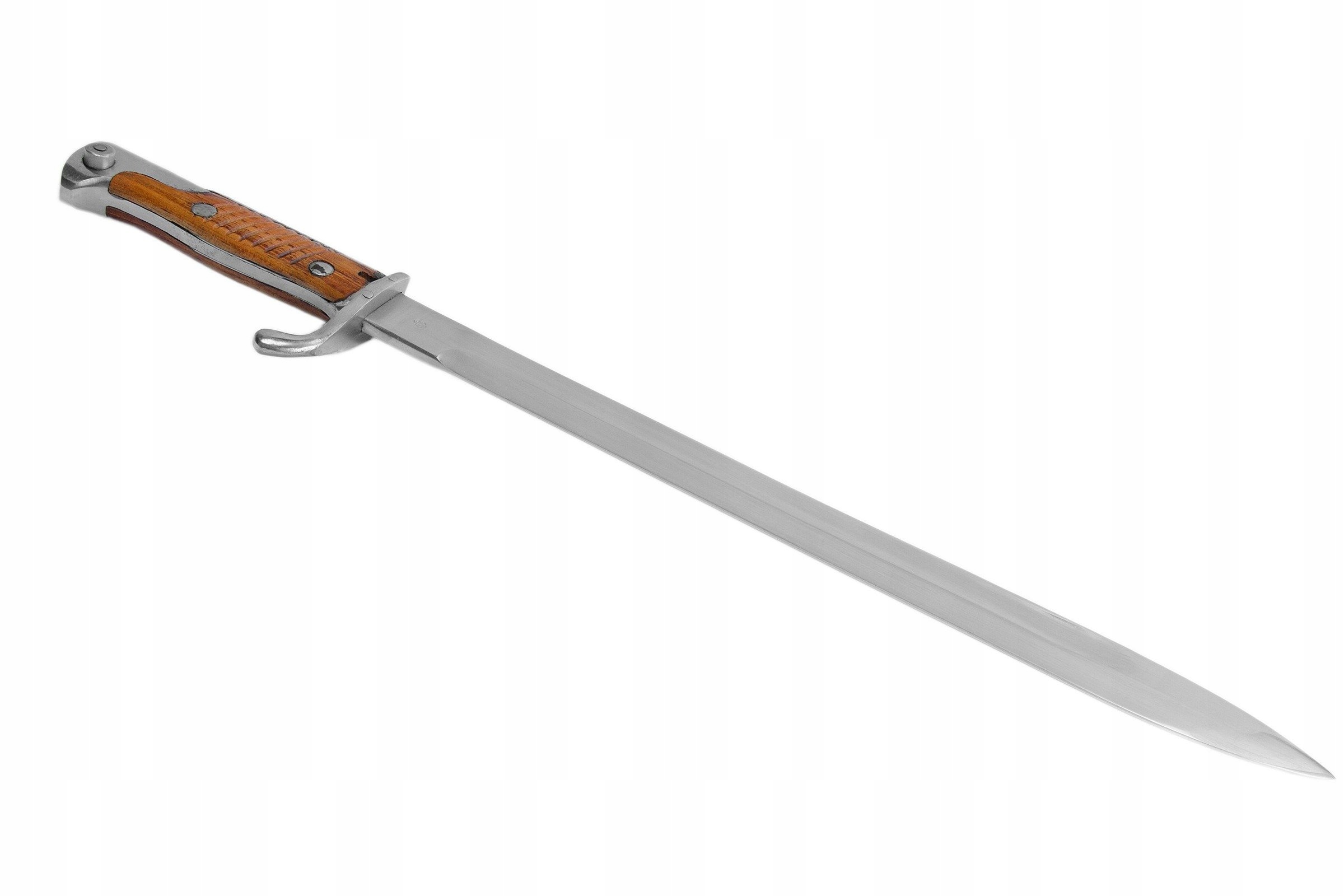 Штык полностью годный к использованию, изготовлен из высококачественной стали, деревянные накладки, покрыты лаком.