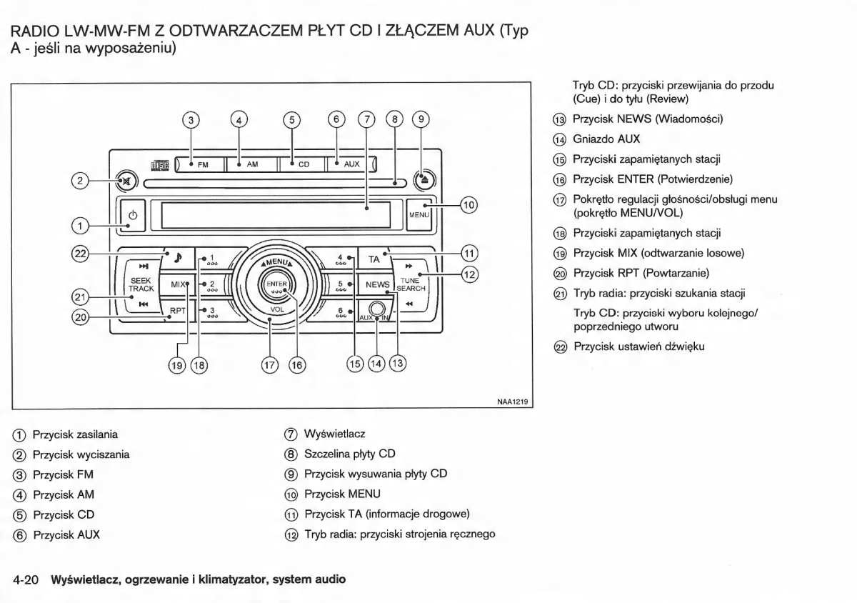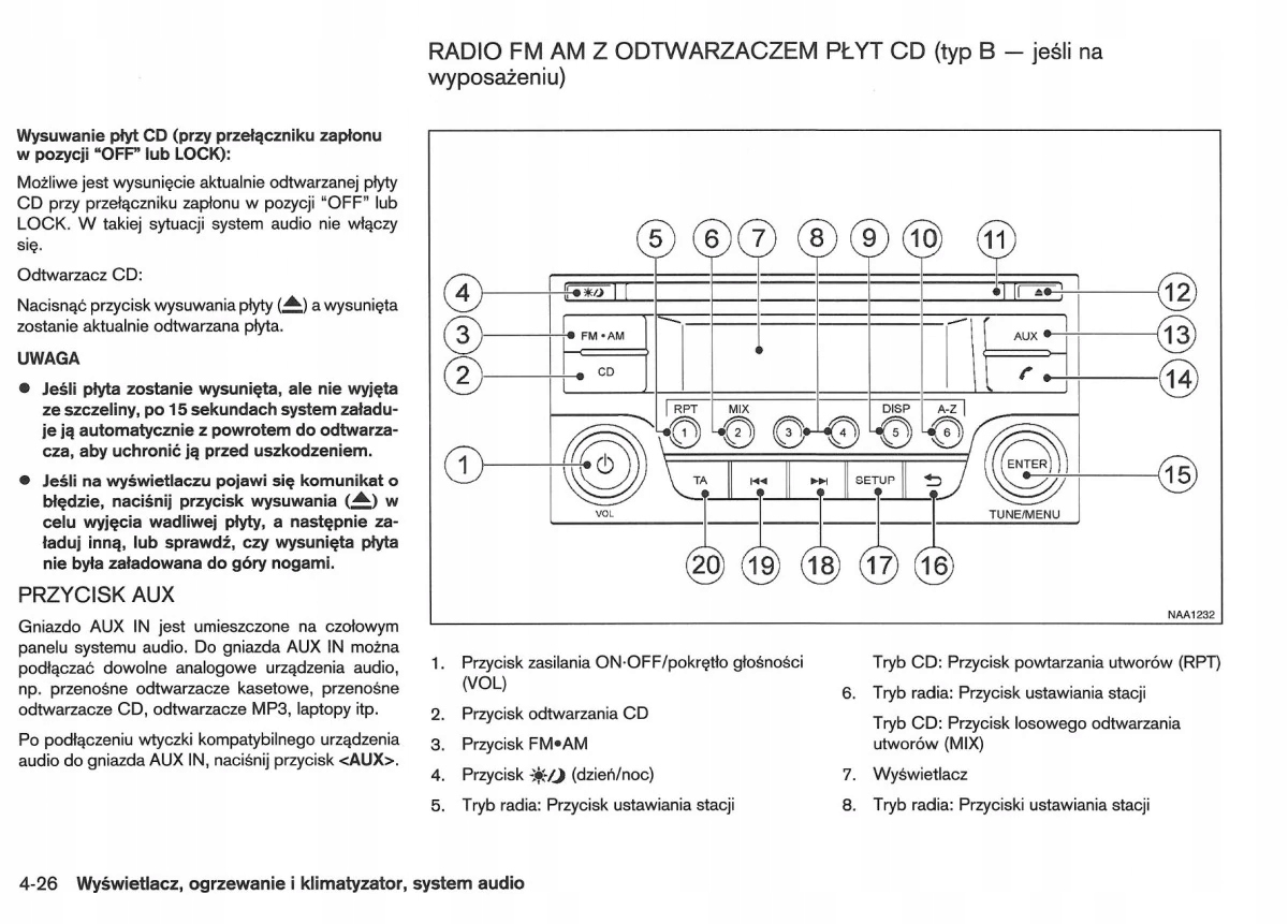 Руководство по эксплуатации Nissan содержит все версии оборудования и полезную информацию о том, как эффективно и безопасно использовать автомобиль, например: - индикаторы, контрольные лампы, открывание и закрывание - освещение и обзорность, сиденья, отсеки для хранения вещей, отопление, вентиляция, кондиционирование воздуха. - вождение, советы по эксплуатации, обслуживание автомобиля - уровни жидкостей, проверка и доливка, аварийные операции, замена колес, предохранителей, замена лампочек - технические данные... и многое другое, дающее путешественникам ощущение безопасности и комфорта. Польское законодательство обязывает продавца приложить к автомобилю руководство по эксплуатации на польском языке. Руководство пользователя автомобиля новое, на польском языке.