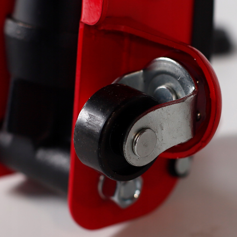У автомобильного домкрата широкие передние колеса с подшипниками, что существенно влияет на уровень стабильность при использовании на различных типах оснований. При этом передние колеса поворотные, а задние – фиксированные.