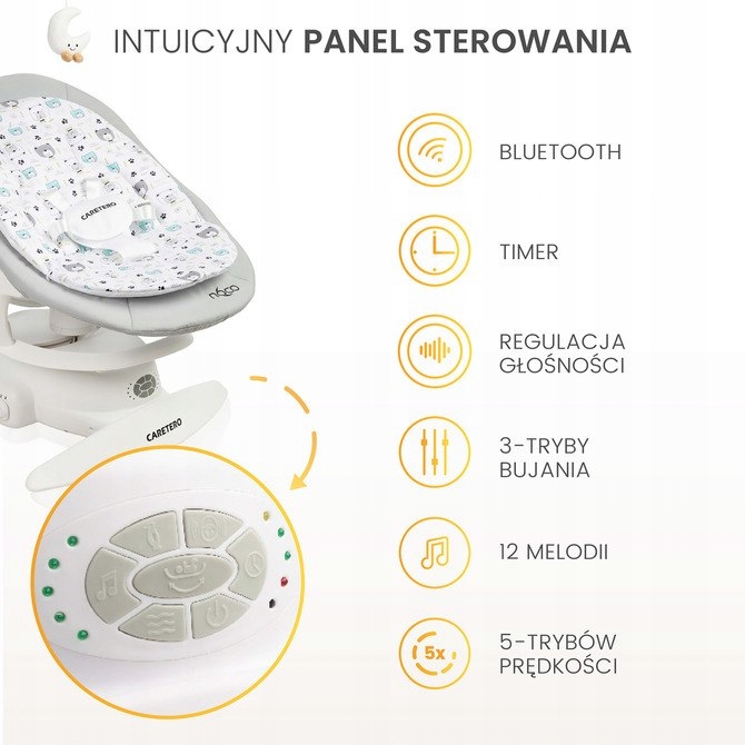 Заботясь о безопасности самых маленьких, модель Noco оснащена ремнями безопасности, которые предотвращают выпадение ребенка из лежака. Функция обнаружения движения автоматически настраивает работу качалки в соответствии с потребностями ребенка, успокаивая его в моменты беспокойства.