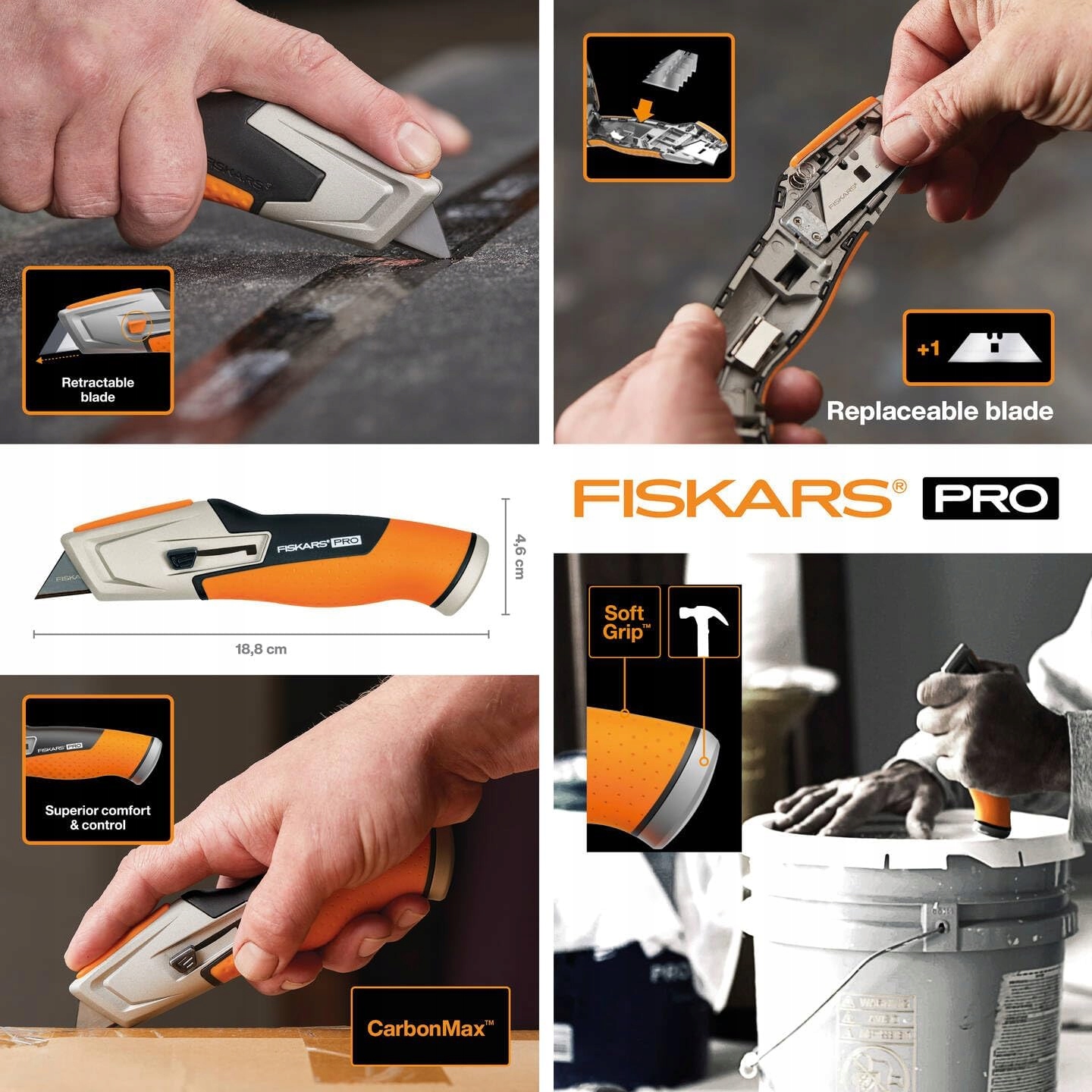 Содержание: 1x Fiskars CarbonMax Универсальный нож с выдвижным лезвием, включая запасное лезвие, длина: 17,7 см, вес: 171 г, материал: нержавеющая сталь/ материал, цвет: черный/ оранжевый, 1027223 p>