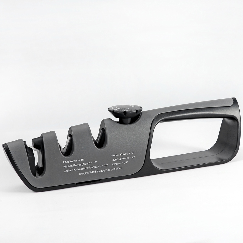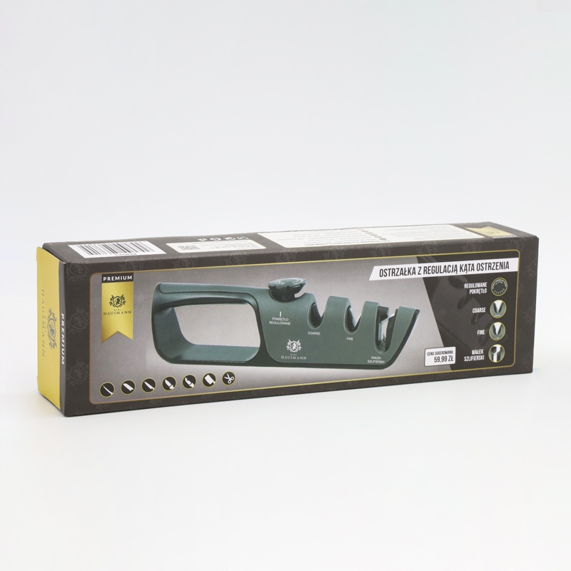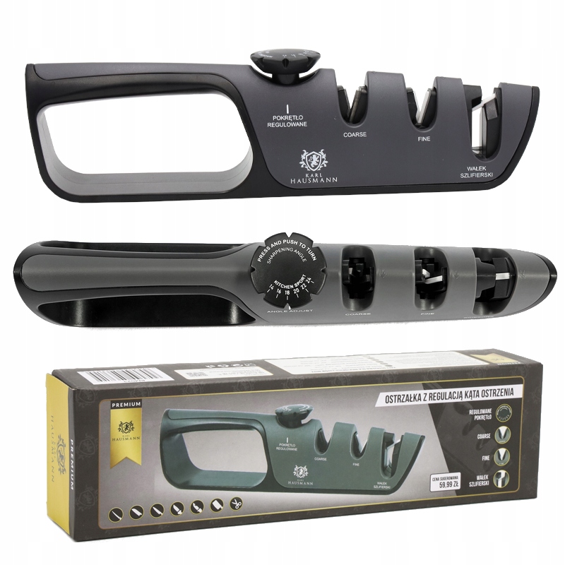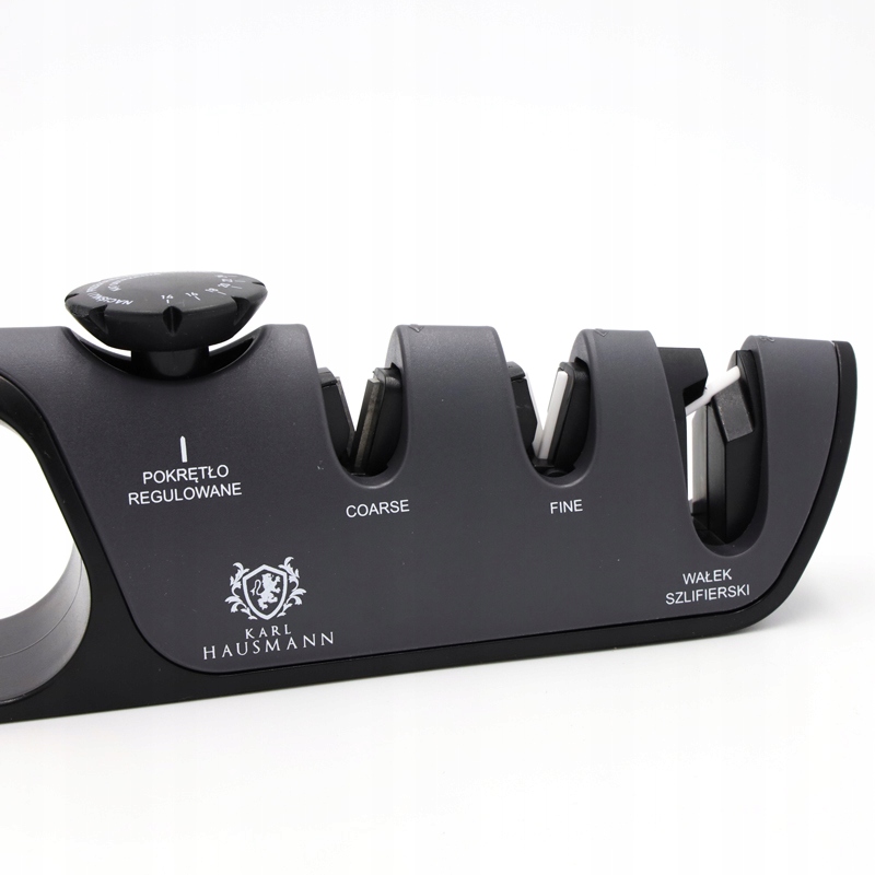 Высококачественная 3-ступенчатая точилка от Karl Hausmann. Прекрасно затачивает любое лезвие. Оснащен регулировкой с помощью ручки, позволяющей затачивать ножи в широком диапазоне углов от 14 до 24 градусов с каждой стороны. Точилка также имеет шлифовальный ролик для заточки ножниц или ножей с одним лезвием.
