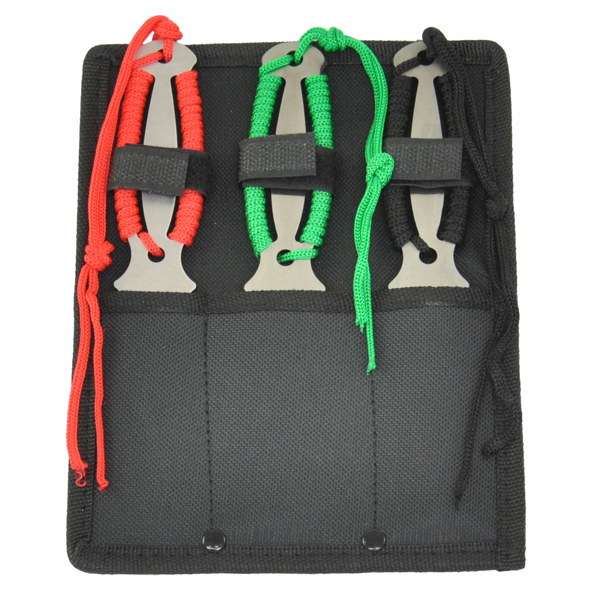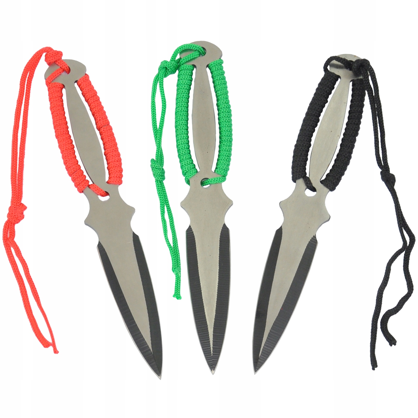 Набор из трех ножей из твердой стали, заточенных с обеих сторон, предназначенных для метания в цель. Ручка-оплетка из веревки 3-х разных цветов. В комплект входят ножны из кордуры с креплением на ремень.