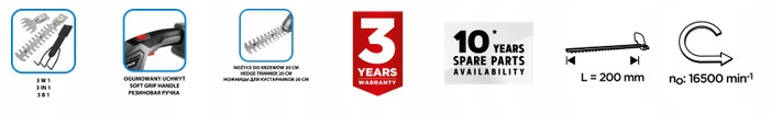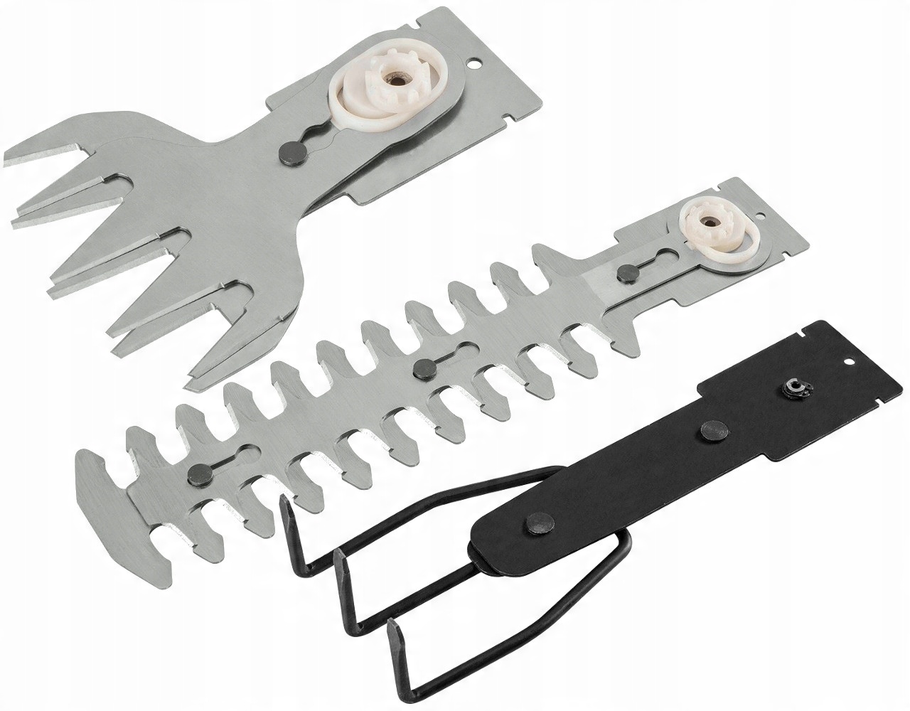 Инструмент предлагается в комплекте с тремя насадками — ножницами для травы, ножницами для живой изгороди и трезубцем.