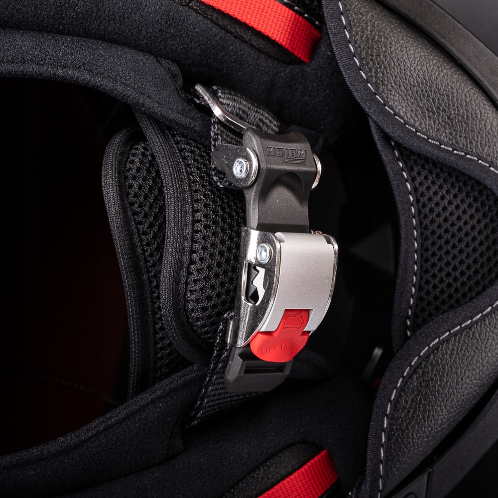 Nolan N80-8 оснащен безопасной микрометрической застежкой. Преимущество такого типа застежек в том, что они легко расстегиваются даже в перчатках, позволяют подогнать шлем под собственные требования и не позволяют шлему сорваться с головы в случае аварии.