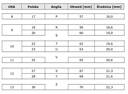 Таблица внизу страницы предназначена только для иллюстративных целей и используется для чтения значений диаметра и окружности польских размеров.