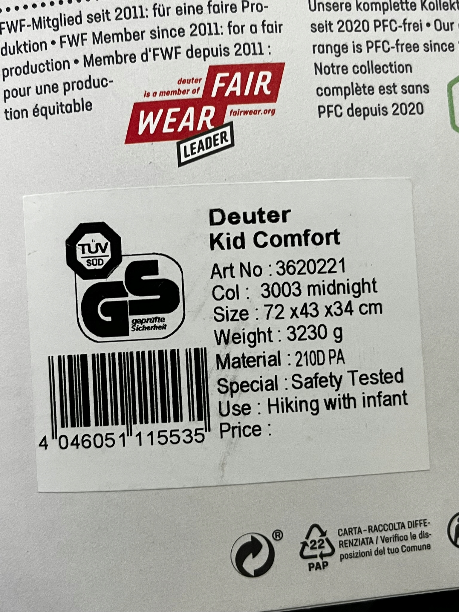 Просматривая «NOSIDEŁKO TURYSTYCZNE DEUTER KID COMFORT MIDNIGHT», вы можете быть уверены, что данный товар из каталога «[rubrica_name]» будет доставлен из Польши и проверен на целостность. В цене товара, указанной на сайте, учтена доставка из Польши. Внимание!!! Товары для Евросоюза, согласно законодательству стран Евросоюза, могут отличаться упаковкой или наполнением.
