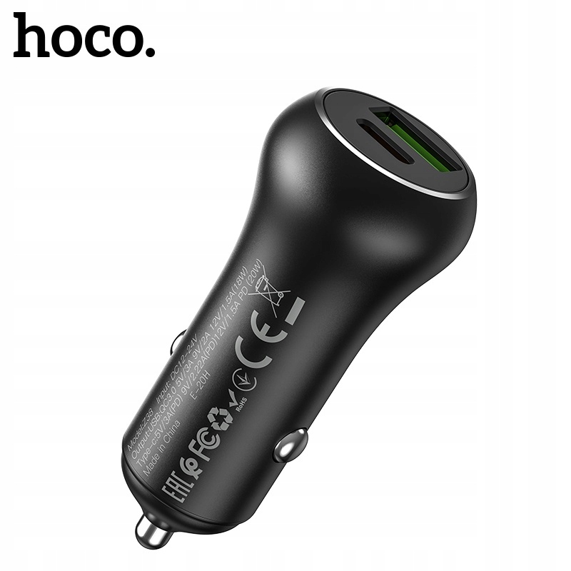 hoco Z38 Resolute — автомобильное зарядное устройство общей мощностью 38 Вт, с двумя портами USB, одним типом USB -C в стандарте Power Delivery/PD 20W и второй в стандарте Quick Charge 3.0/QC3.0, поддерживающий такие стандарты быстрой зарядки, как QC3.0/QC2.0/Huawei FCP/Samsung AFC и быструю зарядку в мобильных устройствах Apple, включая: iPhone 12/мини/Про/Макс.