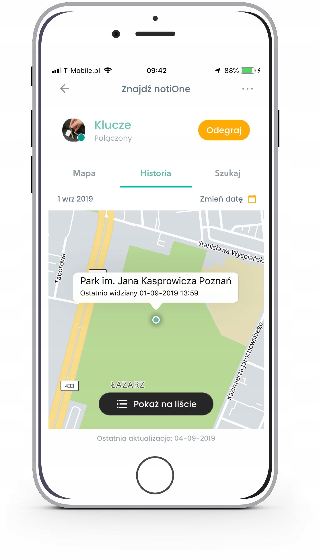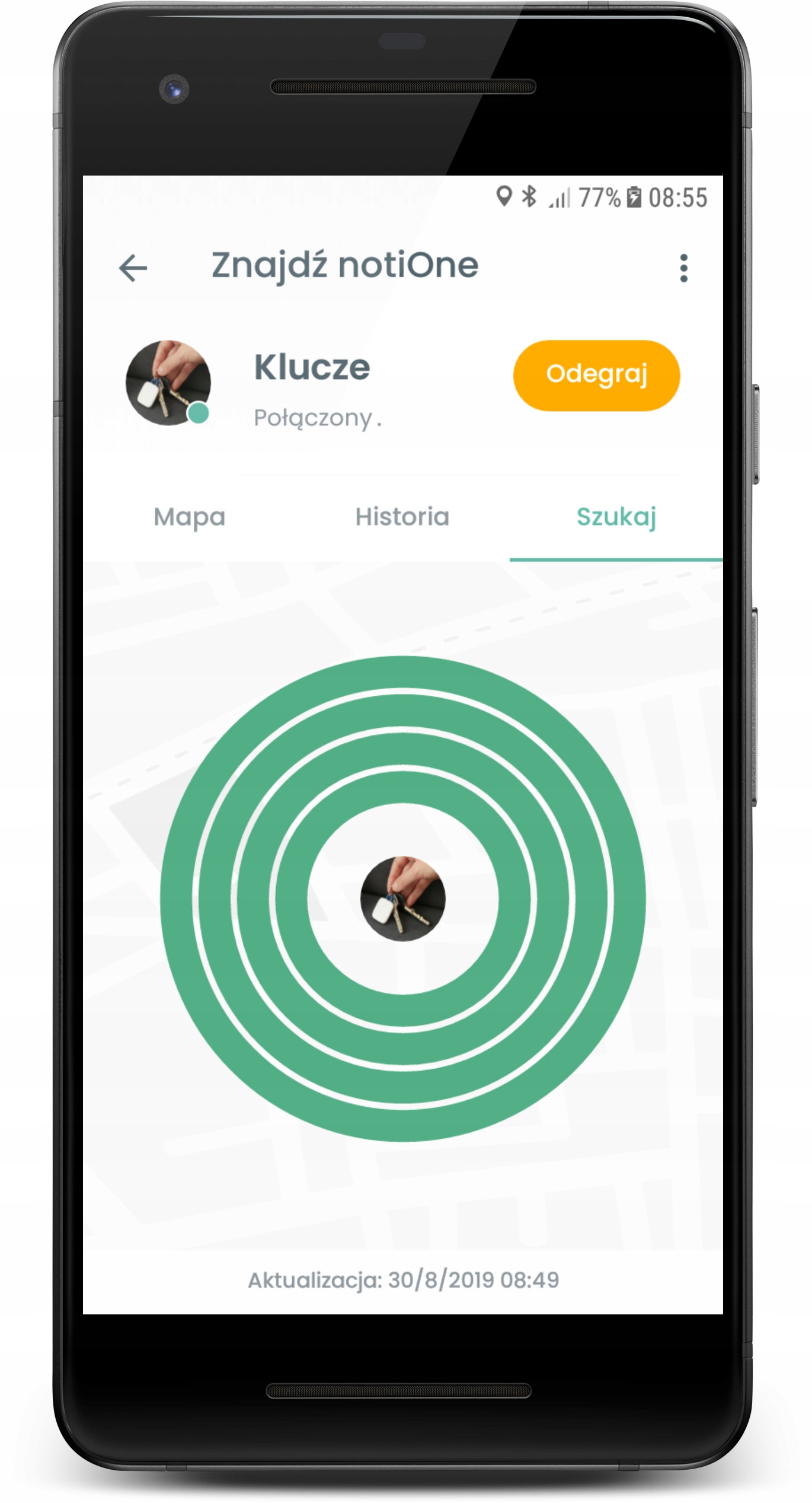 notiOne GO PLUS постоянно отправляет сигнал передачи, позволяющий его идентифицировать. Сигнал автоматически принимается смартфонами с установленным приложением notiOne или другим приложением, совместимым с системой, расположенным в радиусе нескольких десятков метров. Информация о месте пропажи затем отправляется на телефон получателя и отображается на карте приложения notiOne. Таким образом, информацию о местонахождении потерянной вещи можно будет отправить даже из отдаленных уголков Польши!