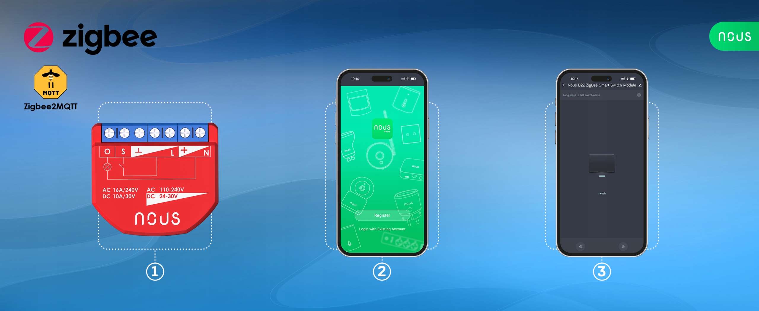 Переключатель NOUS B2Z прост в установке, помещается в стандартные коробки скрытого монтажа и не требует дополнительных кабелей или элементов управления. Просто подключите его к существующей электроустановке и настройте с помощью мобильного приложения NOUS и центрального шлюза Zigbee 3.0. Приложение NOUS Smart Home шаг за шагом проведет вас через процесс подключения реле к сети Wi-Fi и голосовым помощникам.