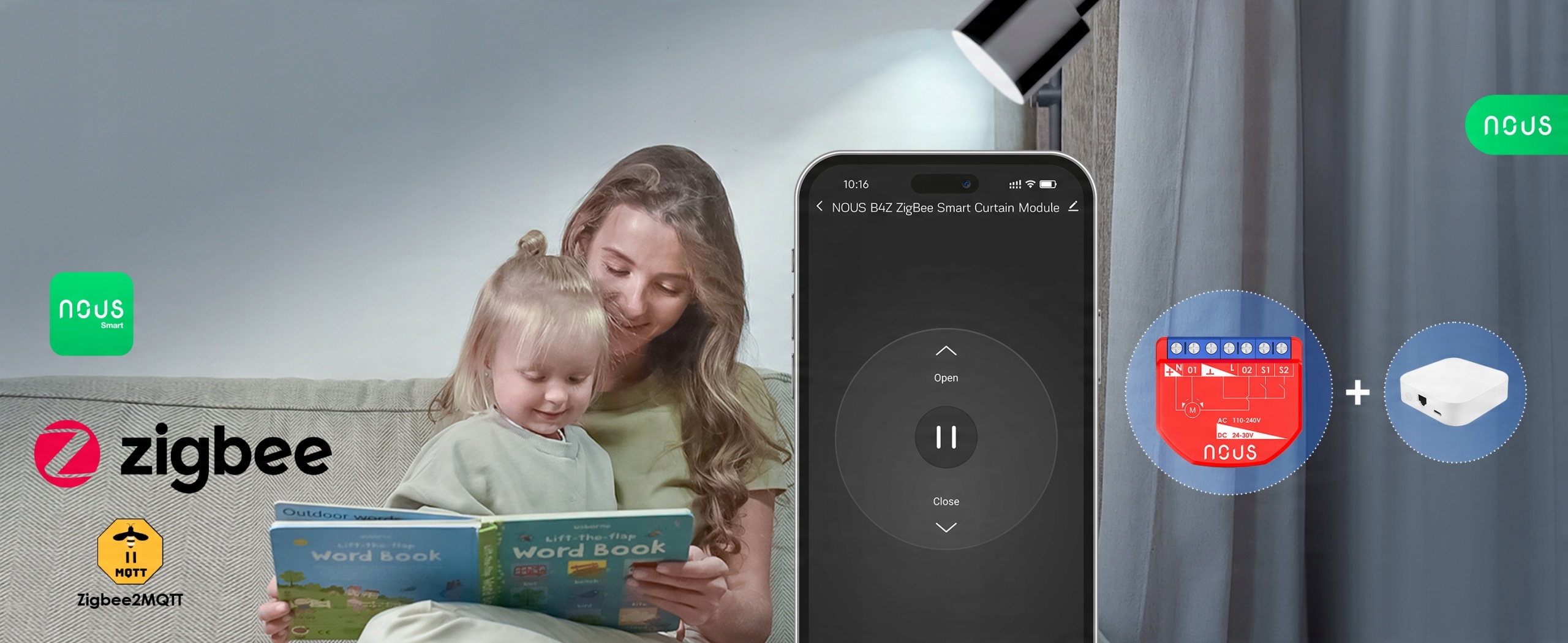 Интеллектуальный модуль контроллера рольставней ZigBee NOUS B4Z не только удобен и комфортен, но также энергосберегающий и безопасный. Управляя жалюзи, вы сможете регулировать количество света и тепла, попадающего в помещение, а также защитить себя от нежелательных взглядов или взлома.