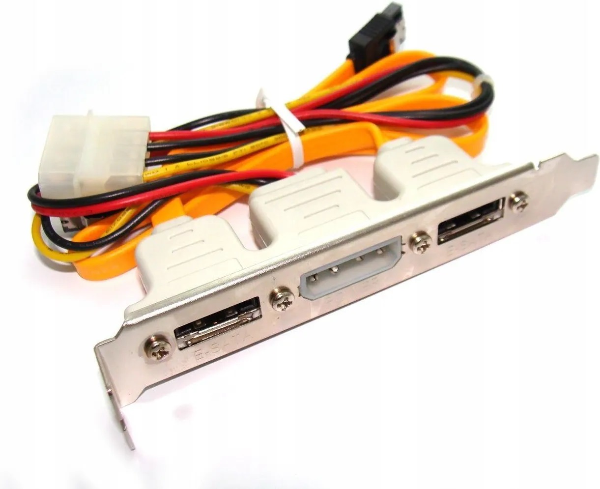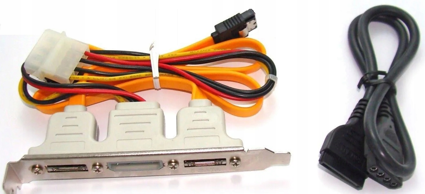 В комплект eSATA входят 2 порта eSATA, 4-контактный кронштейн для корпуса ПК и 4-контактный кабель питания к SATA. С помощью этого комплекта eSATA вы можете легко подключить к компьютеру любое внешнее запоминающее устройство, сетевую систему (NAS).
