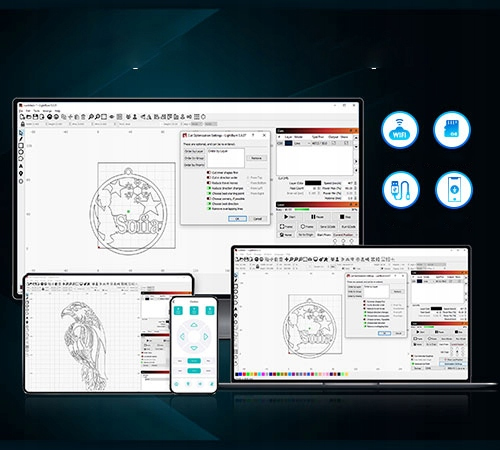 Совместим с Lasergrbl, Lightburn и поддерживает Windows 7+, MacOS и Linux.
