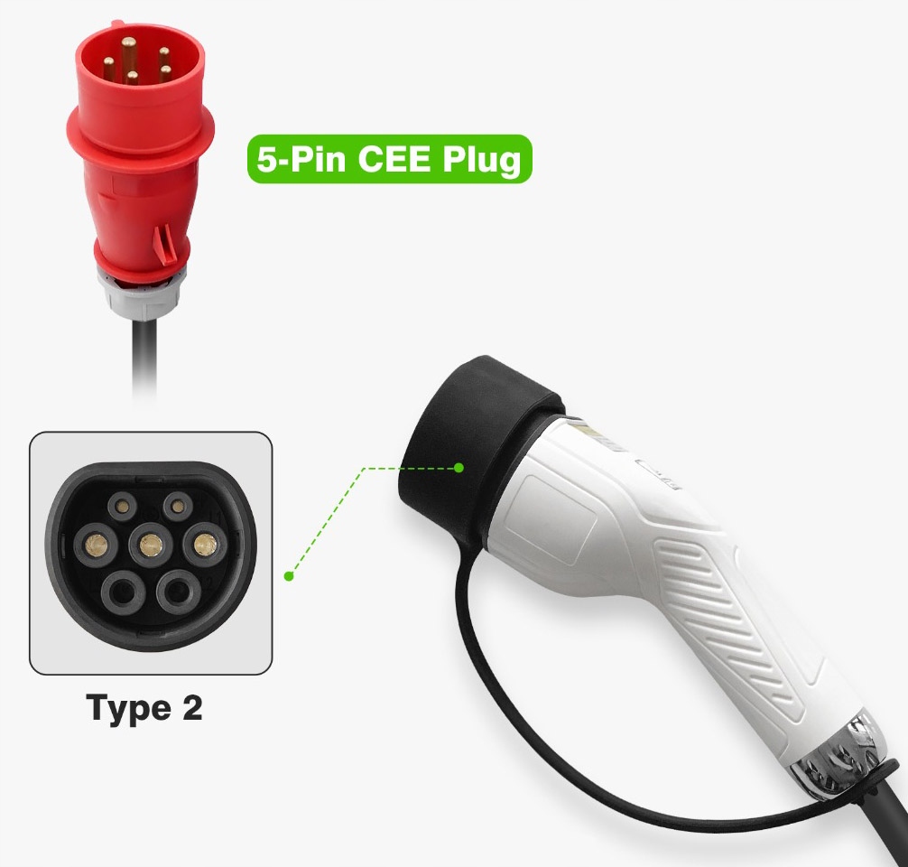 В комплект входит 5-контактная вилка на 32А для гаражной розетки! Если у вас есть розетка на 32А – вам не нужно заказывать установщика для начала зарядки вашего электромобиля!