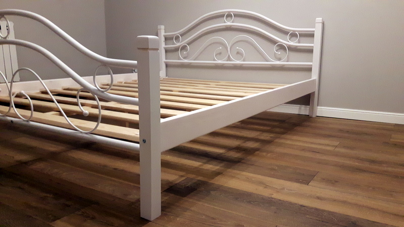 Кровать также имеет усиливающую полосу, которая крепится посередине кровати, и две укрепляющие ножки, которые крепятся под усиливающую полосу. .