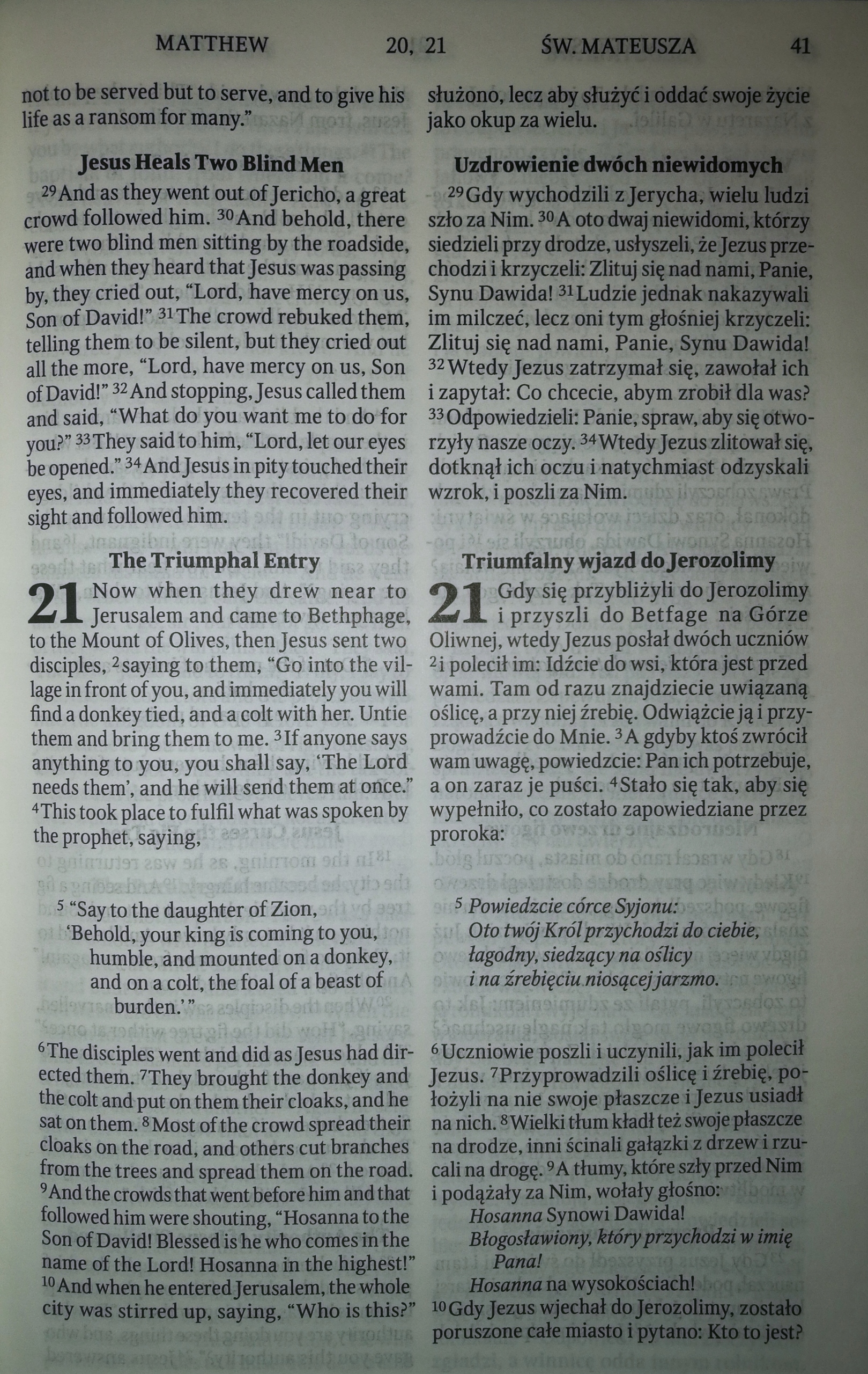 В издании использованы Экуменический перевод Нового Завета на польском языке и стандартная английская версия на английском языке. Тексты размещаются на странице в две колонки. Он был опубликован в сотрудничестве с TBwP и Британским и зарубежным библейским обществом в Англии и Уэльсе.